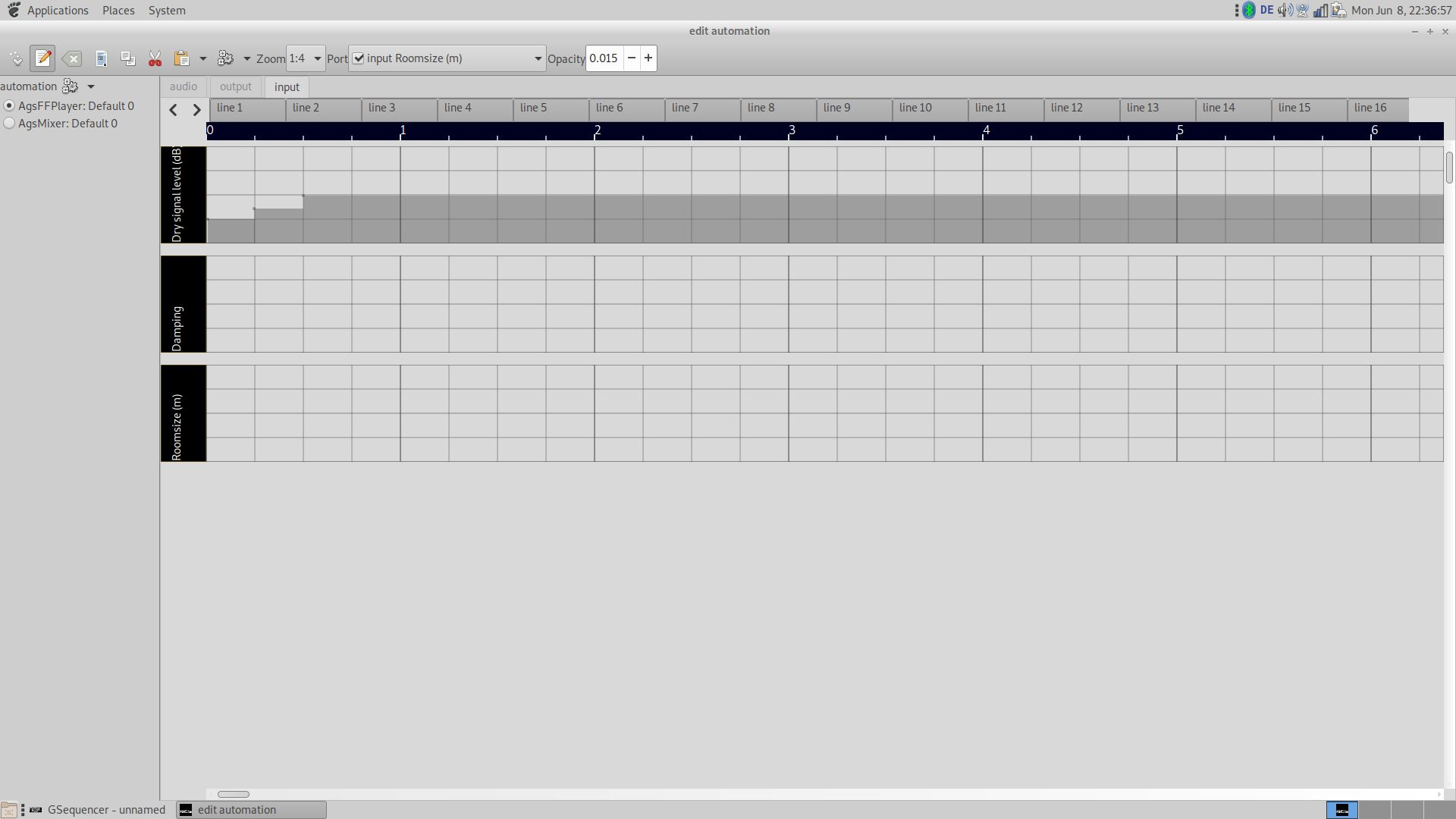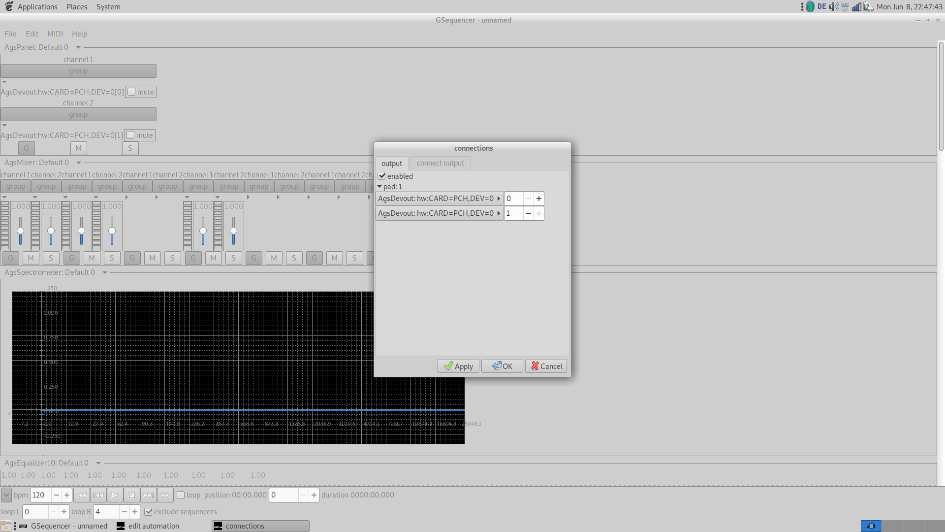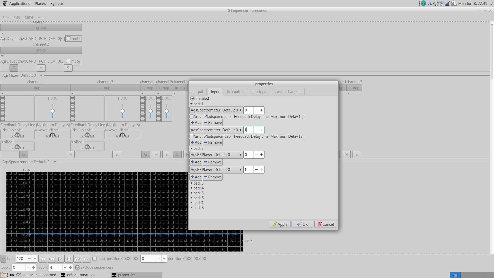 All sources need to be connected to the sink provided by AgsPanel, thus the properties dialog from machine's context menu is responsible. The engine is extensible by following plugin formats: LADSPA, DSSI, LV2 and VST3. It has support for various audio backends like ALSA, Pulseaudio, JACK, OSSv4, WASAPI and CoreAudio.