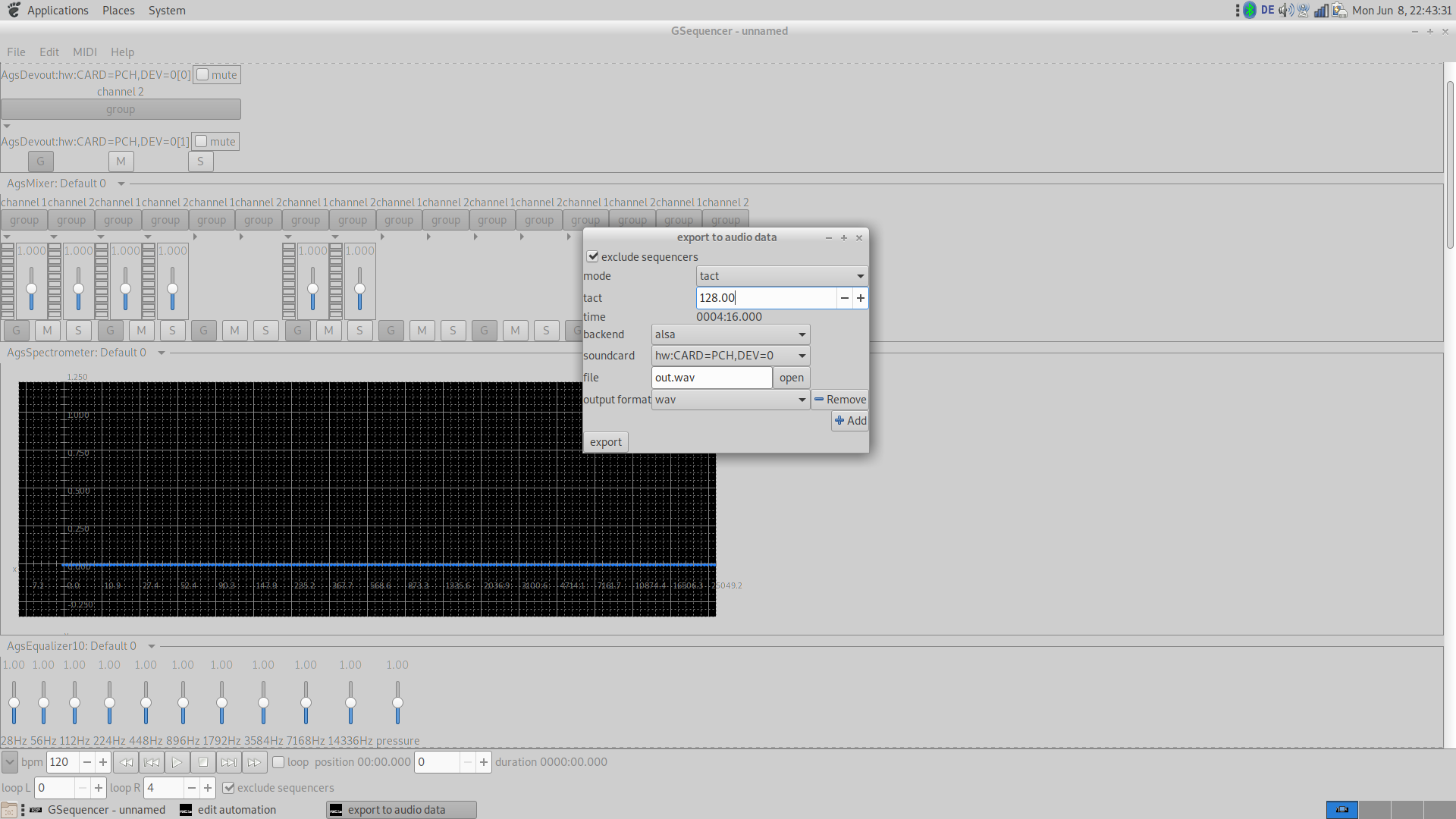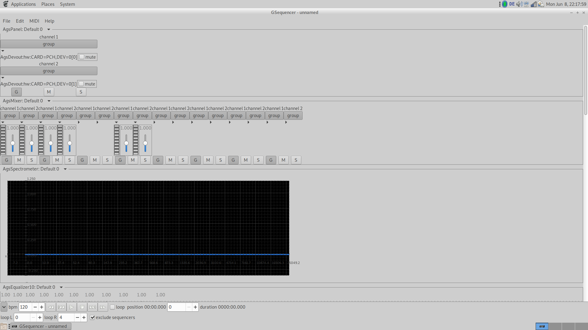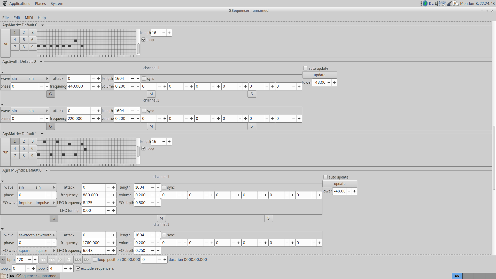 - output panel, mixer, spectrometer, equalizer, drum and matrix sequencer, soft synth, FM soft synth, SF2 synth, SFZ synth, audio file player and recorder